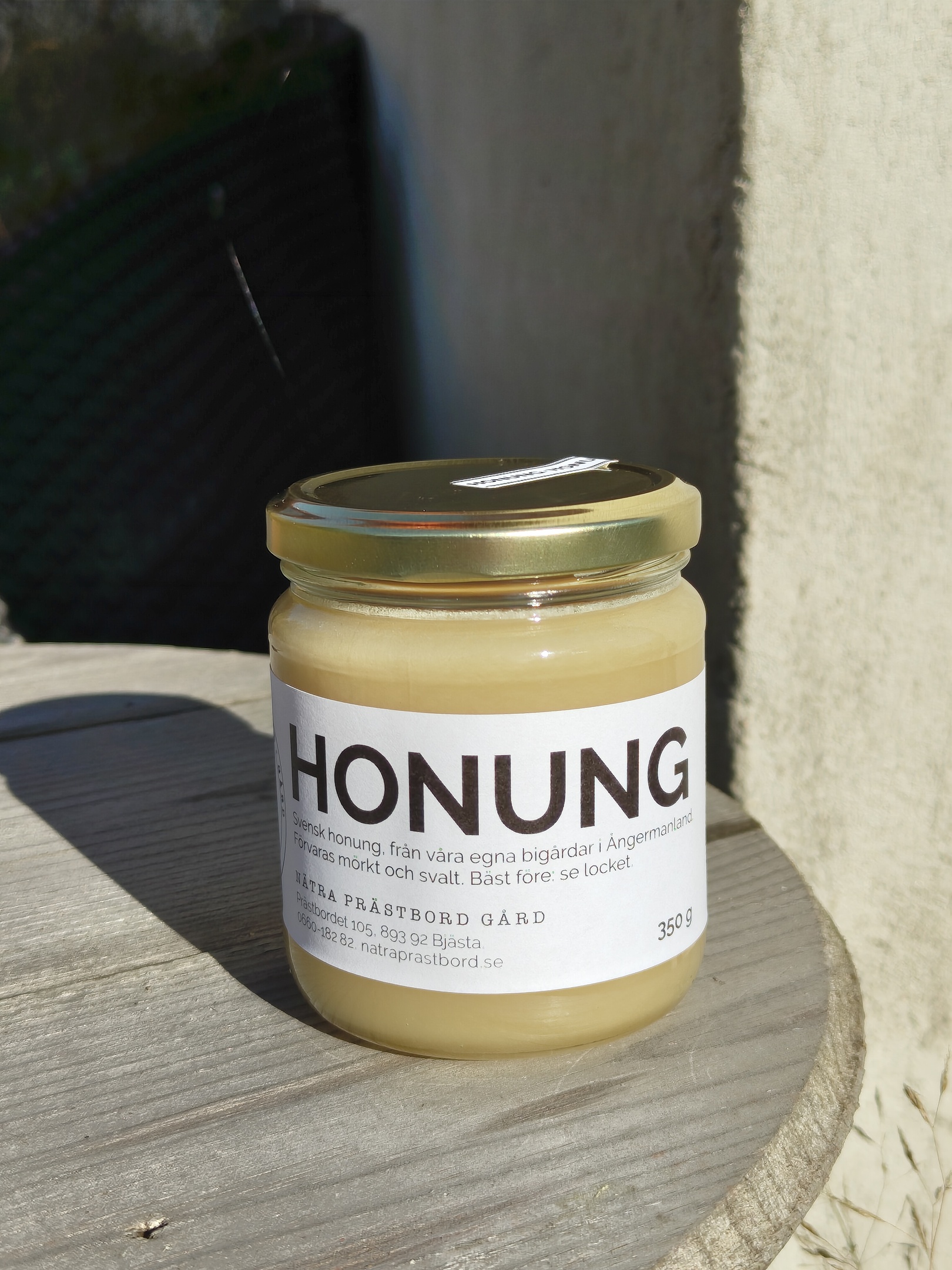 Svensk honung från våra egna bigårdar i Ångermanland. Förvaras mörkt och svalt. 350 g.